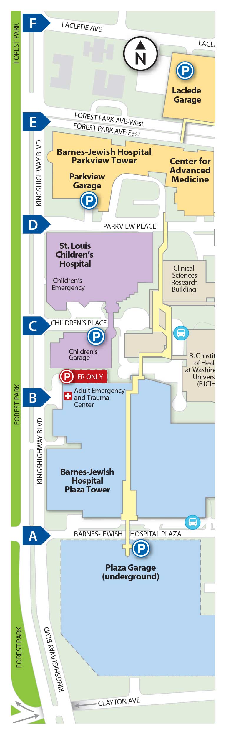 Garage renaming will follow suit. The South Garage, with public entry from Barnes-Jewish Plaza, will become the Plaza Garage. The North Garage, located on Euclid, will become the Euclid Garage. The Laclede/Forest Park Garage, its main entrance on Laclede, will become the Laclede Garage, which also serves to simplify the name.