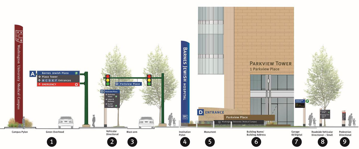 Cloud GeshanThis illustration shows examples of some of the new signs people will see as they visit the Washington University Medical Campus. See the extended graphic below for a more complete view.
