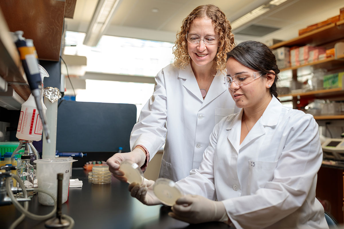 Stallings, an associate professor of molecular microbiology, focuses on understanding how TB bacteria cause disease with a goal of developing better drugs. Currently, people are treated with a combination of four antibiotics given repeatedly over six months. It is difficult for many people to adhere to such a long and complex regimen, and if they fail, their disease is likely to return. Stallings studies how TB bacteria defend against assault by immune cells and antibiotics so they can persist in a person’s body, often for decades. She has discovered that the bacteria produce certain proteins to shield themselves, and interfering with these bacterial defenses can help treat disease. Stallings has three patents related to targeting TB bacteria. Two are designed to enhance the effectiveness of antibiotics already used for treating TB by interfering with the bacteria’s ability to withstand stress. The third describes a new potential antibiotic for TB that also targets the bacteria’s stress response.