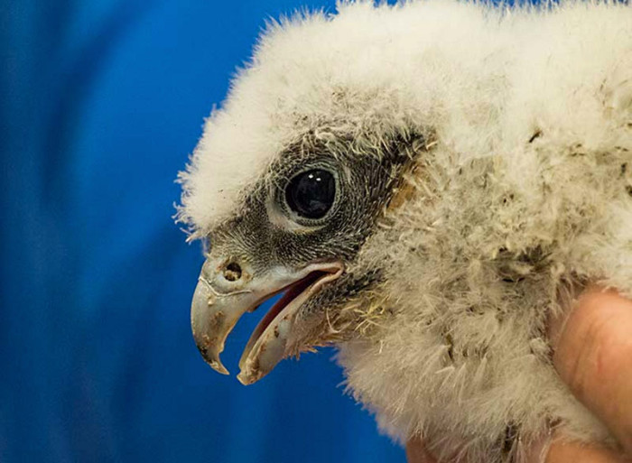 Each year a peregrine falcon returns to her nest on the Medical Campus to hatch and raise chicks, and experts from the World Bird Sanctuary visit to band the baby birds